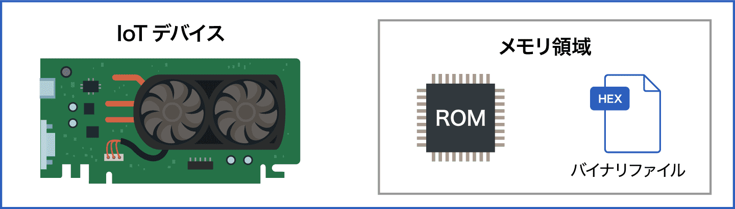マイクロコントローラを採用したIoTデバイスの場合、ファームウェアはハードウェアに組み込まれたソフトウェアのことで、ハードウェアを制御するための処理がプログラミングされたモノの機能を担うソフトウェアです。ファームウェアはハードウェアとソフトウェアの中間的な性質を帯びることが特徴で、ファームウェアはハードウェアのメモリ領域で稼働するため、ソフトウェアでありながらもハードウェアと一心同体のようにも見えます。ファームウェアはハードウェアのメモリ領域に書き込む(プログラム)することになり、一般的にはハードウェアに書き込むファームウェアのデータ形式として「Intel HEX」という汎用的な形式であるテキストファイルが存在します。