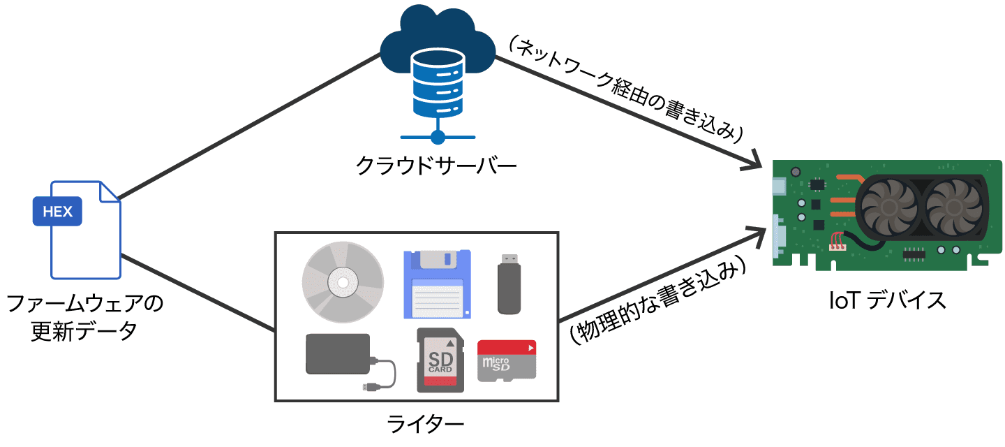 ファームウェアを更新する手段として考えられるのはネットワーク経由の「クラウドサーバ」と物理的な書き込みで用いられるリムーバブルメディア、データ書き込み器などの「ライター」です。遠隔地の更新が多いIoTデバイスはネットワーク経由のクラウドサーバーを用いることで、ファームウェア更新ができるシステム構築をすることが望ましいです。