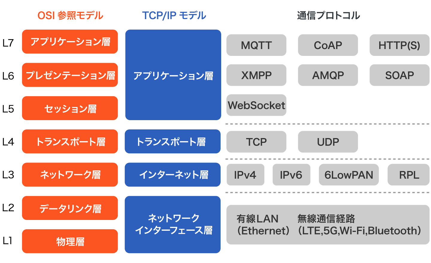 IoTに限らず通信プロトコルは「OSI参照モデル」「TCP/IPモデル」の階層構造によって分類されています。