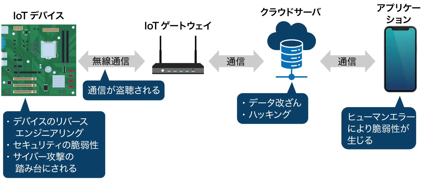 最後はセキュリティについても気をつけなければいけません。IoTに限らずシステムには悪意のある攻撃者が忍び込もうとする侵入口が多く存在し、特に要注意なのは「構成要素間の連結部(インターフェース)」です。IoTではシステムの動作原理上、外部接続口を開けておく必要があるため、サイバー攻撃に対しての脆弱性が多く存在します。