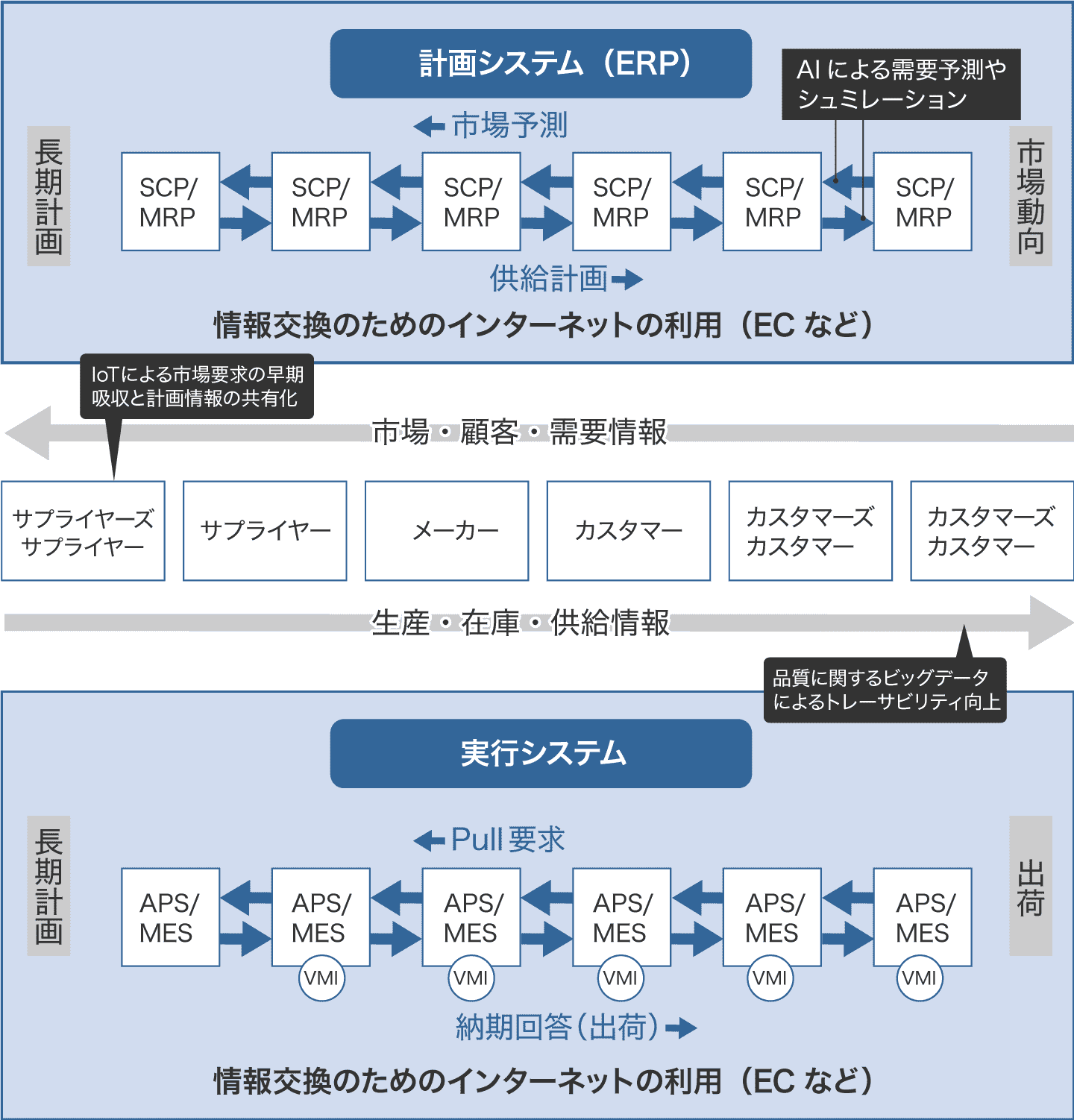 サプライチェーンプロセスでは、市場、顧客、需要情報の順で考える「ERP」の計画システムと、生産、在庫、供給情報で考える実行システムが存在します。