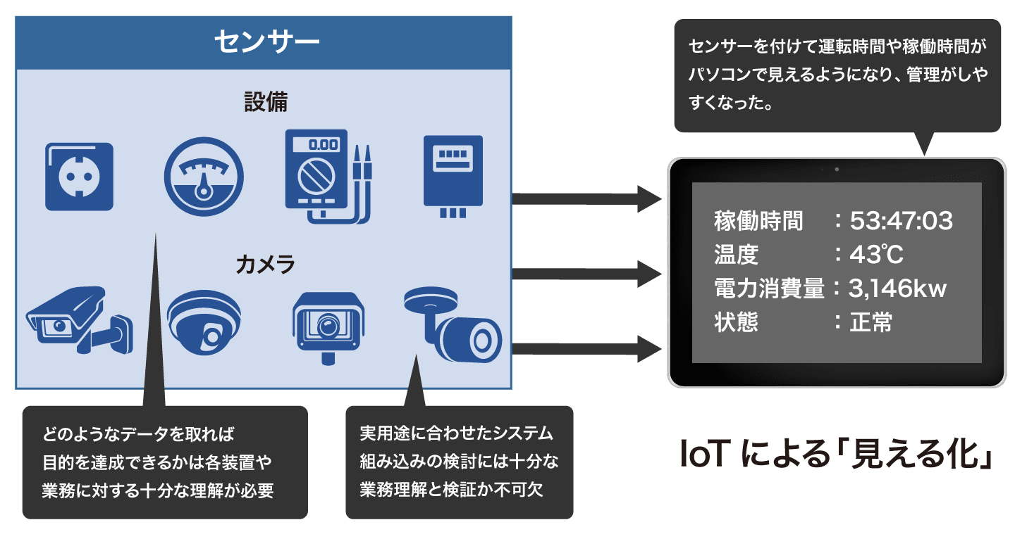 | IoTデバイスの選定 | 収集したいデータに合わせて、適切なIoTデバイスを検討。 | |