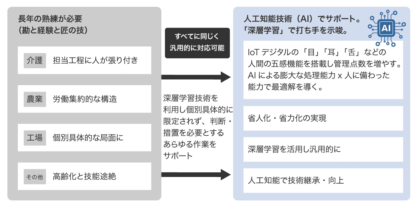 工場における自律化は、従来人間が行ってきた「勘と経験と匠の技」のような属人化したものではなく人工知能(AI)でサポート、「深層学習」で打ち手を示唆のような考え方に変わります。IoTデジタル技術で人間の5感の役割を担い、深層学習(ディープラーニング)を活用し汎用的な考え方を構築します。人工知能で技能を継承し向上させ省人化、省力化の実現が、IoTとビッグデータとAIを活用し現場にフィードバックし改善を続けることで、最終的には工場の自律化がゴールとなります。