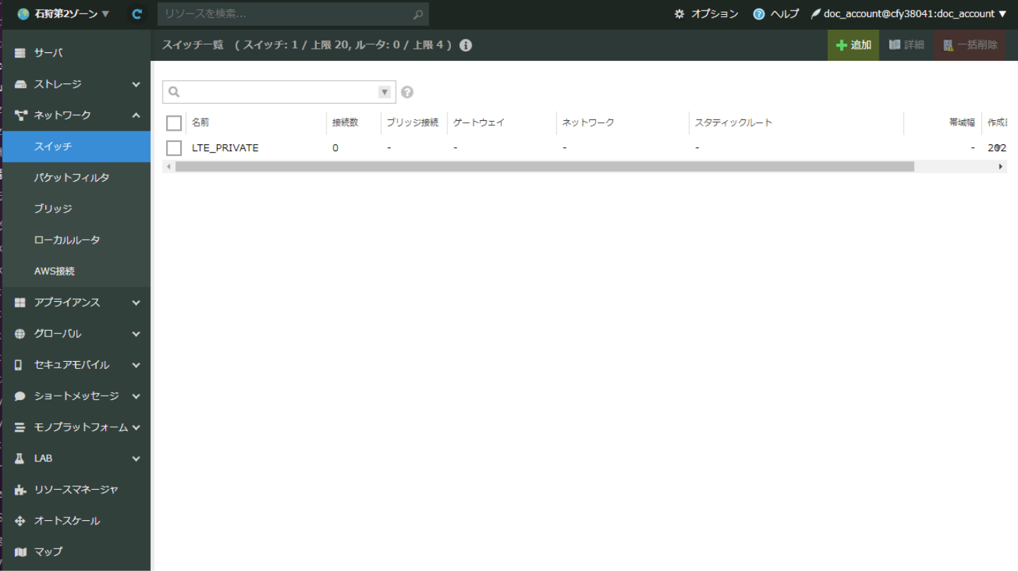 ①さくらのクラウドコントロールパネルメインメニューより「ネットワーク」を選択し、左側のサイドメニューから「スイッチ」を選択します。