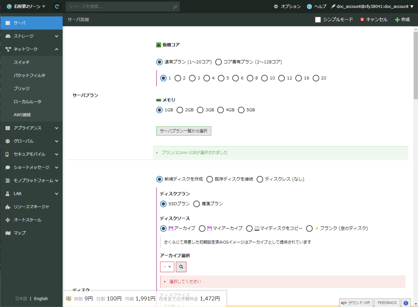 今回の用途では通信対向機としてのサーバは最小の構成でも十分ですので、通常プラン1コア、メモリ 1GBを選択します。