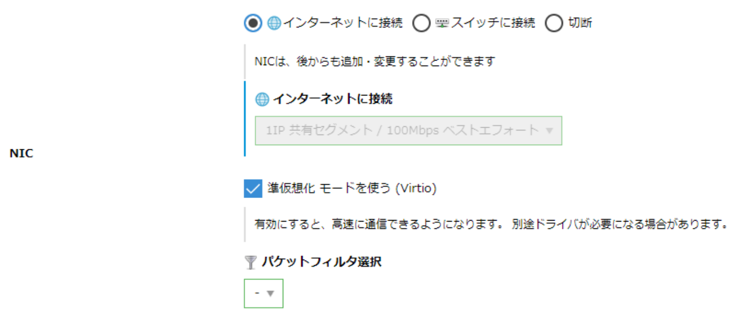 一旦ここではインターネットへの接続用のNICのみ用意します。