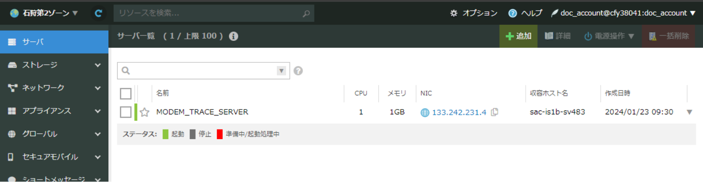 ①さくらのクラウドのコントロールパネルメインメニューより「サーバ」を選択します。「サーバ一覧」画面が表示されるので、先ほど作成したサーバ行をダブルクリックします。