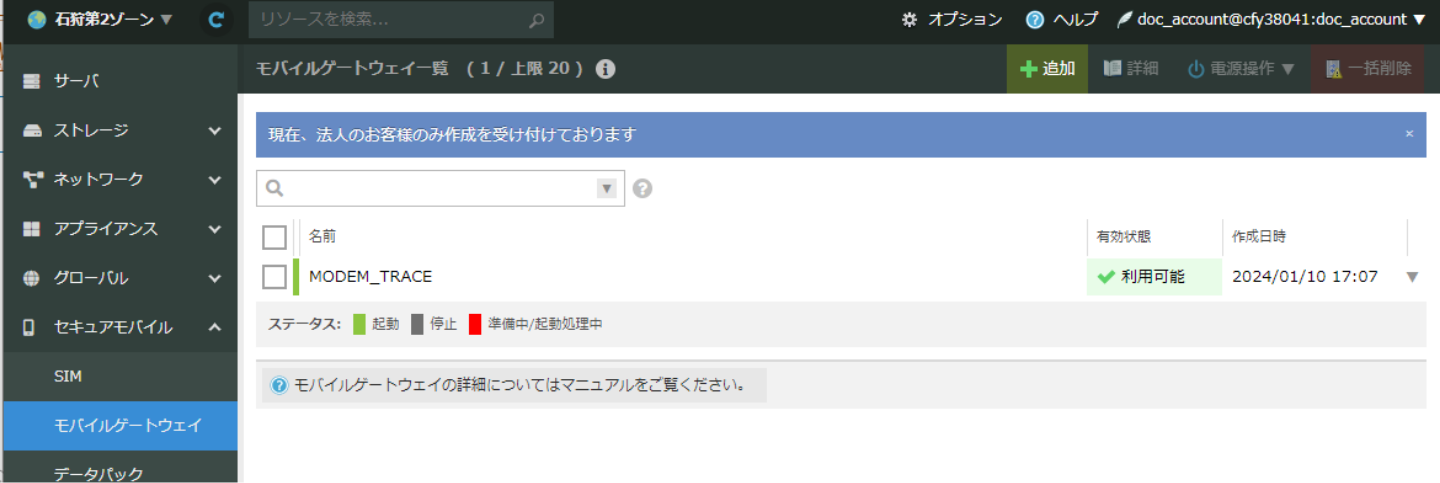 ⑤再度左側のサイドメニューから「モバイルゲートウェイ」をクリックし、「モバイルゲートウェイ一覧」の画面に、新たなモバイルゲートウェイが作成されていることを確認します。