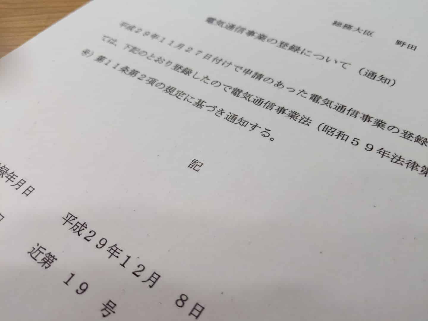 電気通信事業者の登録完了