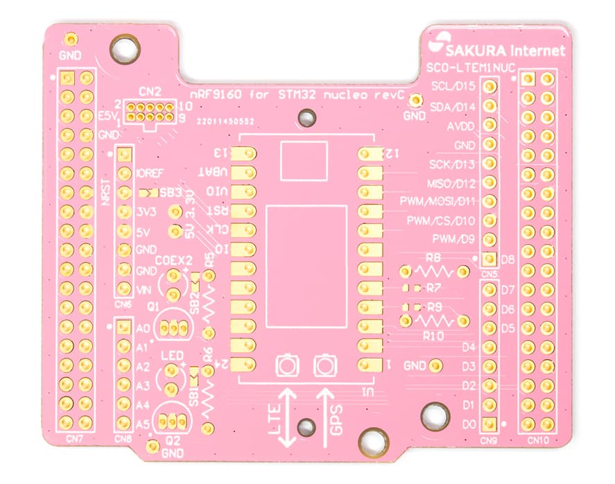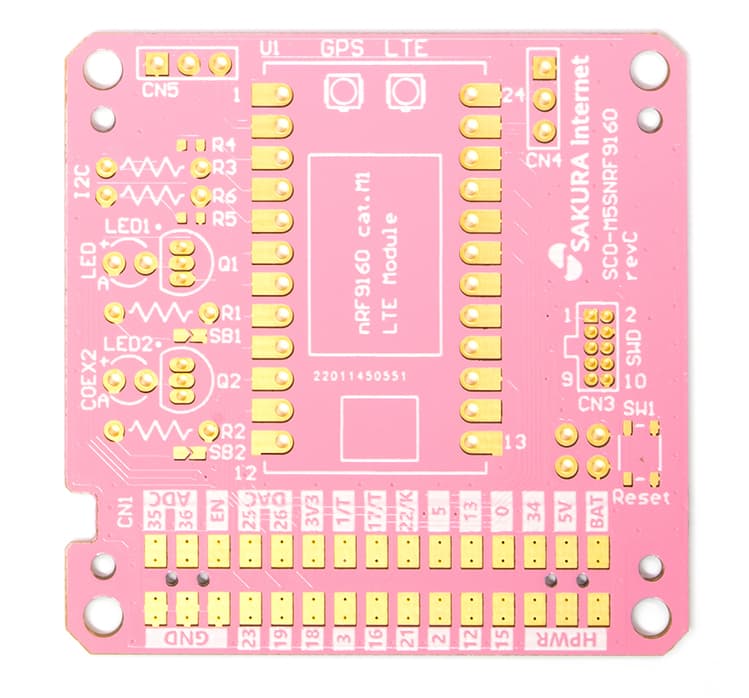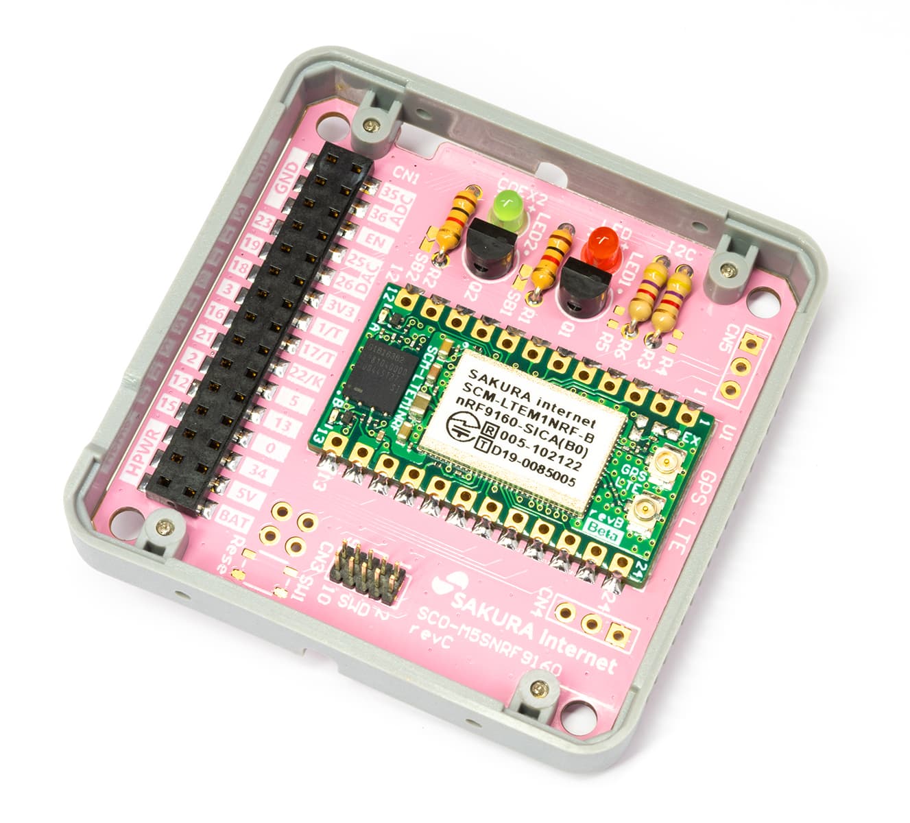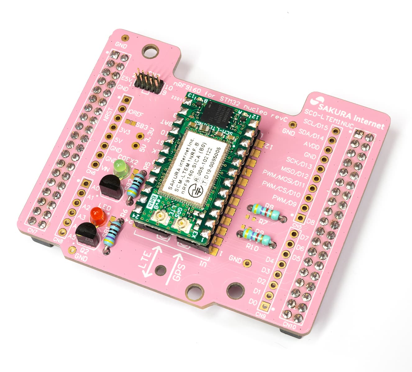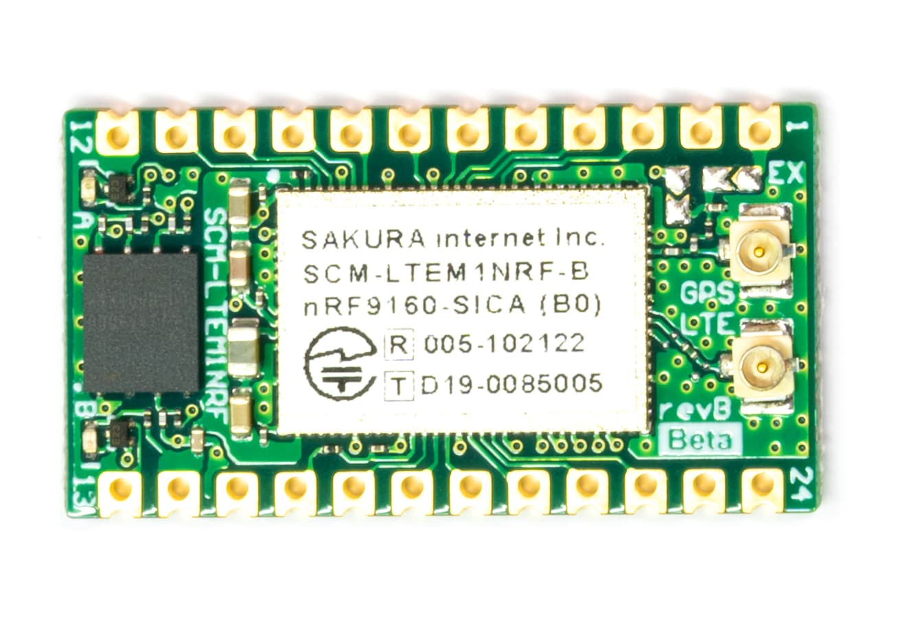 LTE M(Cat.M1)モデムとしてNordic社製nRF9160、通信経路としてさくらのセキュアモバイルコネクトのチップ型SIMを搭載。任意のボードに直接接続するほか、別途提供される拡張基板を使うことでそれぞれの汎用マイコンボードでの開発が可能になります。