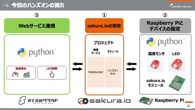 そんな中で先日、「sakura.ioをRaspberry Piにつないで、Pythonのプログラムで操作するハンズオンセッションをやってほしい」という依頼を受けました。sakura.io体験ハンズオンの内容はかつてさくナレに書きましたが(「IoTの世界に触れてみよう!『sakura.io体験ハンズオン』へのお誘い」)、ArduinoやNode-REDを使って実習しています。それに対して今回は使用する機材やプログラミング言語が異なるので、従来のハンズオンを参考にしながら新たに教材を作成しました。
