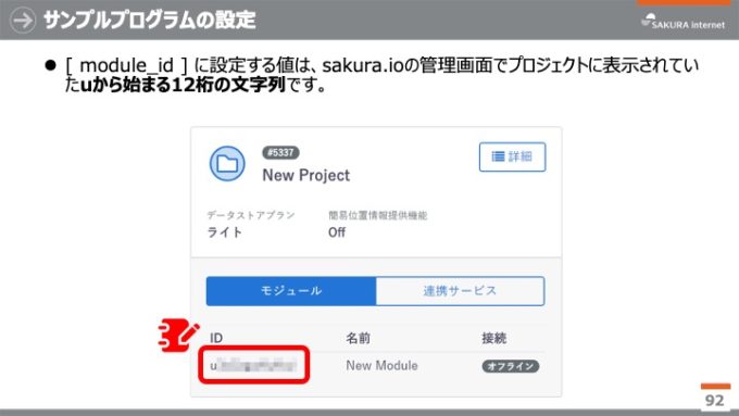 sakura.ioのコントロールパネルでプロジェクトに表示されている、uから始まる12桁の文字列がsakura.ioモジュールのIDです(下図)。これを下記の行の"uxxxxxxxxxxx"の部分に貼り付けます。# 【要設定】sakura.ioモジュールのID module_id = "uxxxxxxxxxxx"