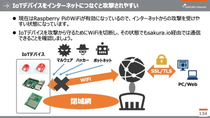 sakura.ioは、IoTデバイスをインターネットに接続せず、閉域網につなぐことでセキュリティレベルの向上を図っています。そこで、今回の実習で使用するシステムができあがったら、IoTデバイスを攻撃から守るためにRaspberry Piのインターネット接続を切断し、その状態でもsakura.io経由でデータの送受信ができることを確認します。