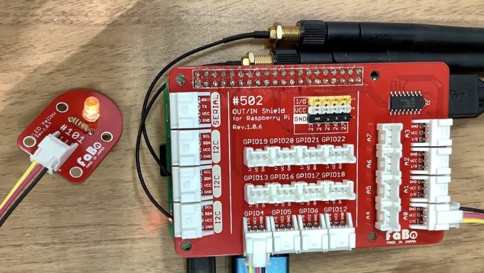 IoT向けのプロトタイピングツールです。各種機能が実装されたモジュールを線で結合することでIoTハードウェアの試作ができます。今回はRaspberry Pi用のスターターキットを用意し、それに含まれている温度センサーとLEDをRaspberry Pi用シールドに接続して使用します。