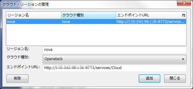 HybridfoxでOpenStackを管理するには、まず「リ―ジョン」ボタンをクリックして接続先を登録する。「リージョン名」には適当な識別用文字列を、「クラウド種別」では「OpenStack」を選択し、「エンドポイントURL」に「http://<nova-apiサービスが稼働しているホスト>:8773/services/Cloud」を指定して「追加」をクリックする(図1)。