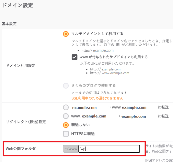 - コントロールパネルのドメイン/SSLメニューより、example.comのWEB公開フォルダを ~/www/wp に変更