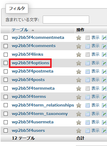 - 右画面にテーブルの一覧が展開されますので、「(接頭文字)options」のテーブルの「表示」をクリックします。下の場合は接頭文字が「wp2bb5f4」になっているので、「wp2bb5f4options」のテーブルの「表示」をクリックします。