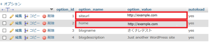 - 「home」「siteurl」の「option_value」に入っているURLが現在、WordPressの一般設定画面で設定されているURLなので、これを変更前のものに修正します。修正は鉛筆マークをクリックする事で行う事ができます。