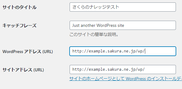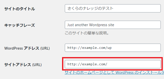 - WordPressの【設定】>【一般】でWordPressアドレス(URL)とサイトアドレス(URL)を http://example.com/ に修正