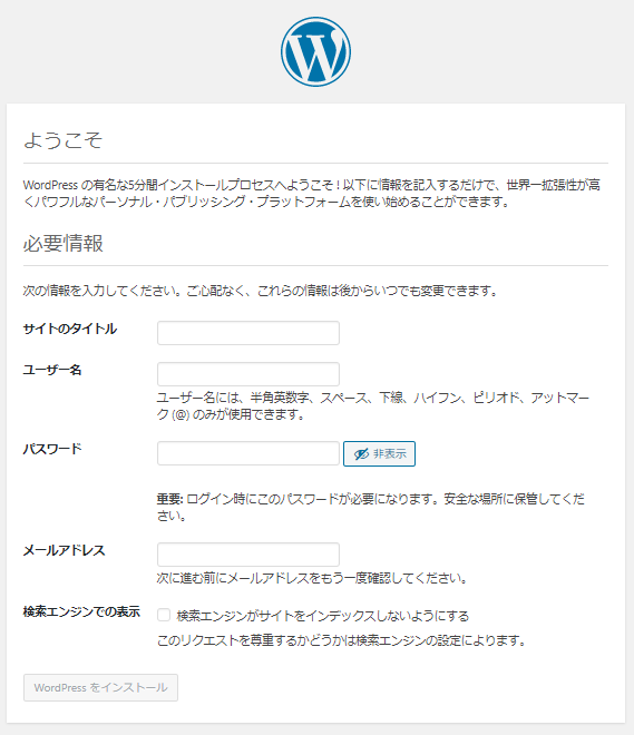 WordPress新規インストールする時に、下記の初期設定画面にアクセスする必要がありますが、この時点でアクセスしたURLがそのまま公開URLとして使われてしまいます。