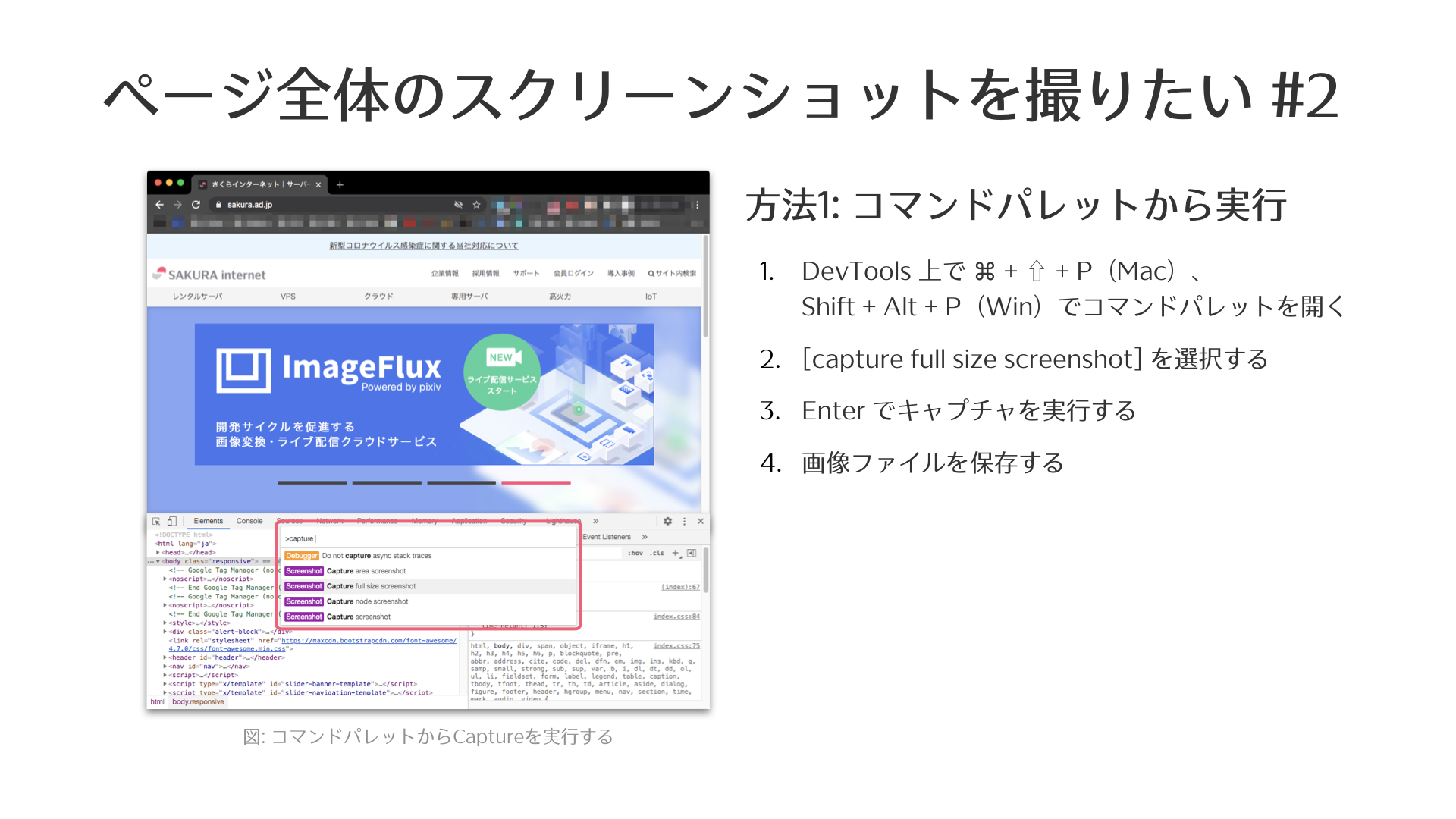 あとは拡張機能(エクステンション)とかを使って全部ページを撮影するってことはあるんですけど、実はこれってDevToolsの標準機能で使えたりします。ここですね、"Capture full size screenshot"っていう機能を使うとページ全体が撮れます。