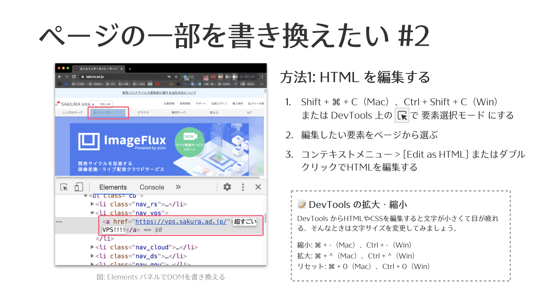 まず、HTMLを直接編集する方法ですね。Macだったら「Shift+Command+C」。Windowsだと「Control+Shift+C」。もしくはDevToolsの一番左の"Select an element in the page to inspect it"ボタンを押すと、要素の選択モードに切り替わるので、そこで例えば「VPS」を選んで、字が見えてますかね。ここを例えば「超すごいさくらのVPS」みたいな感じで書き換えできます。