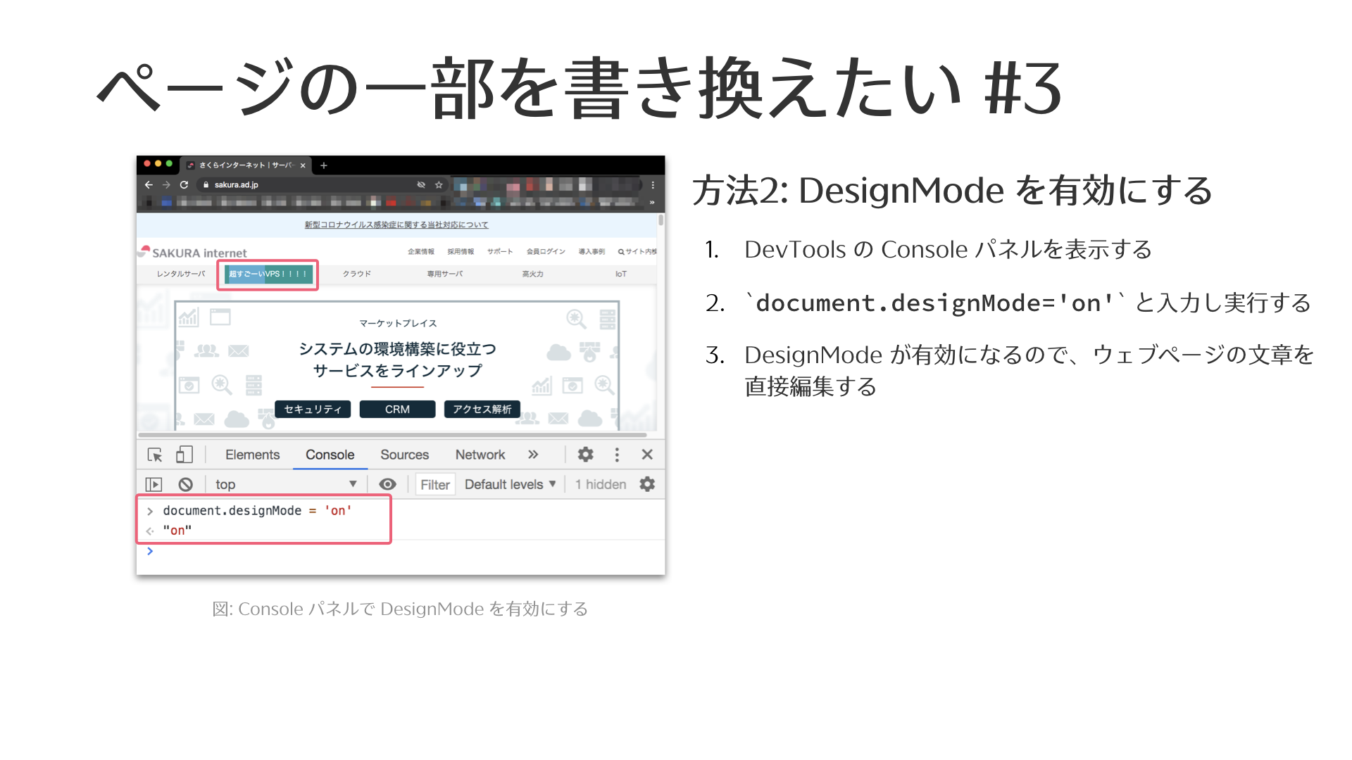なので、こういうふうに連続で書き換えたい場合は、Consoleタグに「document.designMode = ‘on’」を入力します。今"off"なのでこれを"on" に書き換えると、ここが直接書き換えられるようになります。