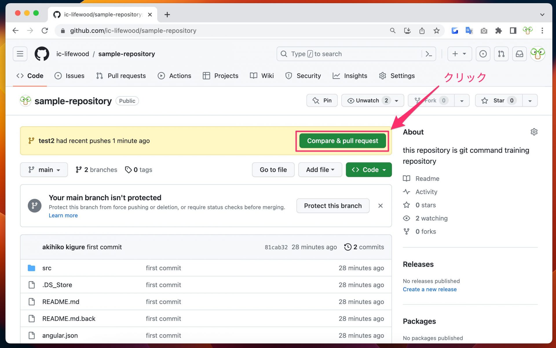 git push後にリポジトリを見ると上図のように「Compare & pull request」ボタンが表示されます。このボタンをクリックします。