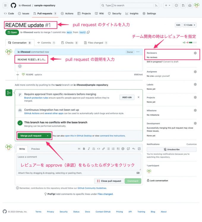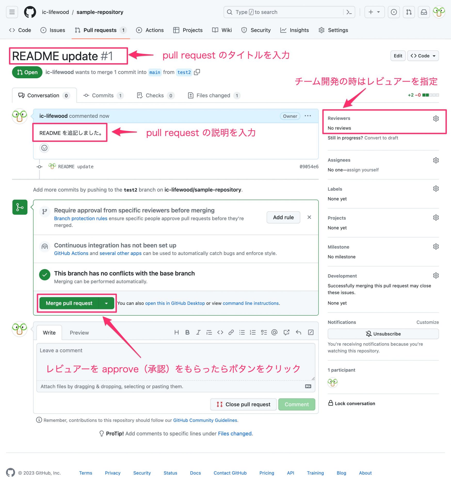 レビュアー(Reviewer)のapprove(承認)をもらったら、「Merge pull requet」ボタンをクリックして、作業したファイルをリポジトリにマージします。