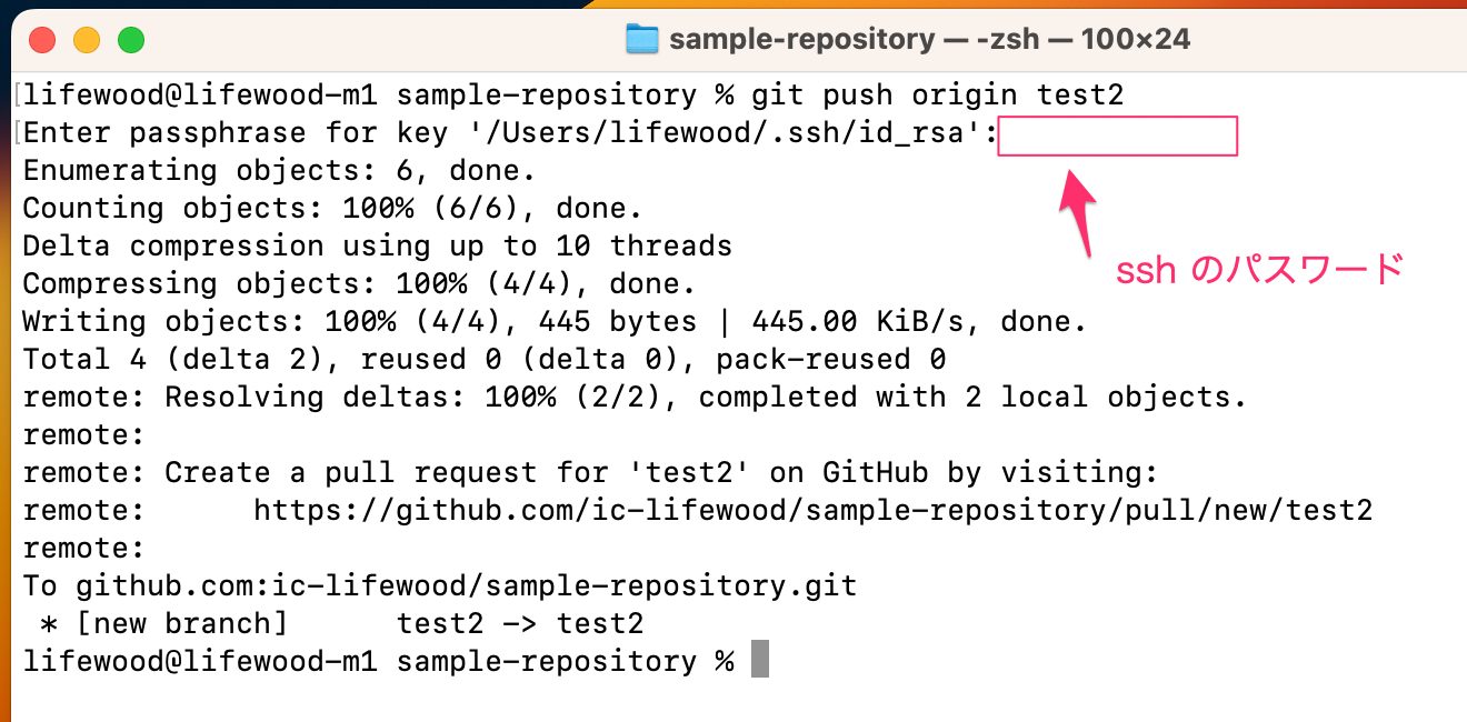 git pushコマンドでは、実行中にsshのパスワード入力が必要です。これを省略することもできますが、そのためには省略設定が別途必要です。