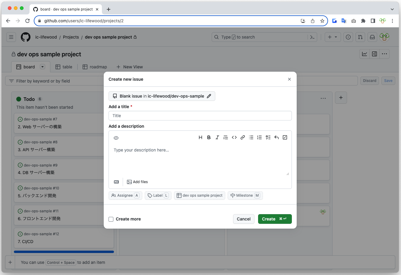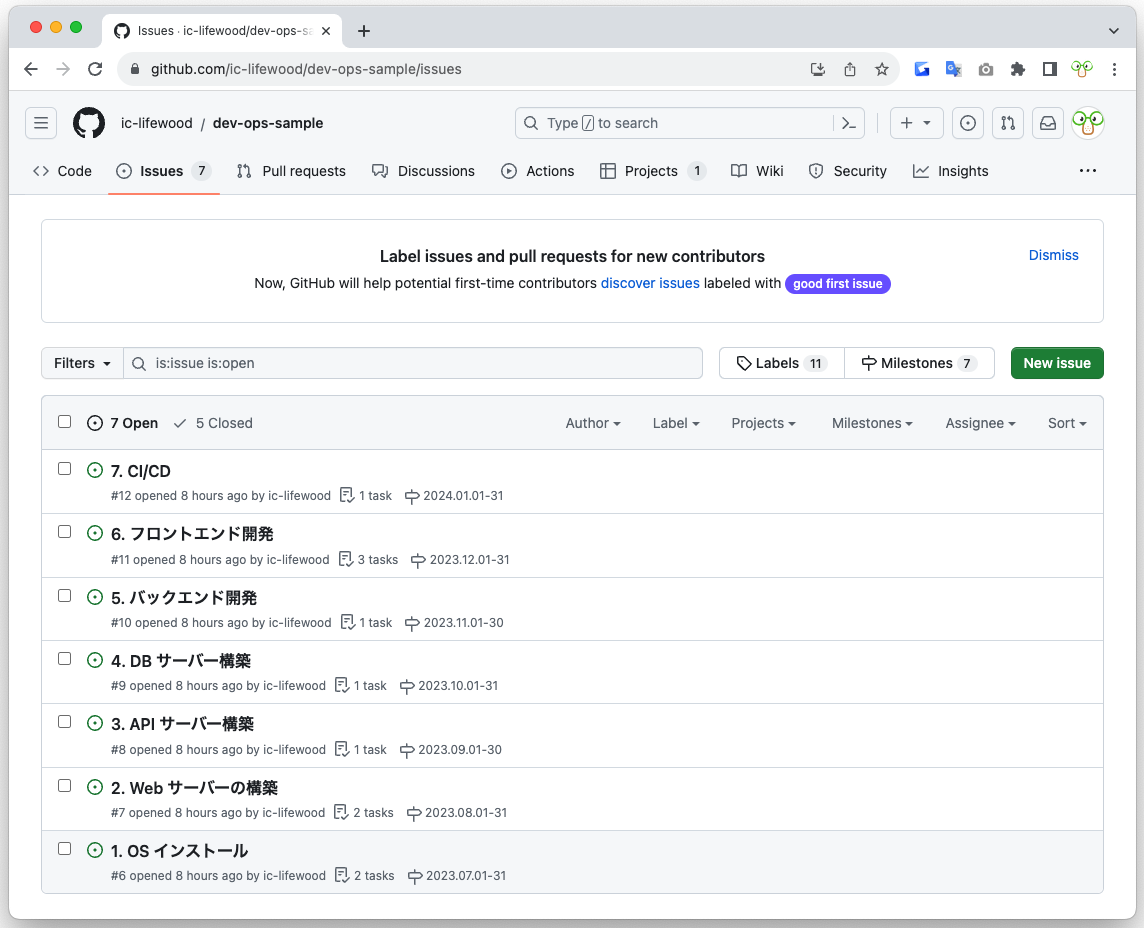 これらの設定を終えた後のissueの画面は以下のようになります。