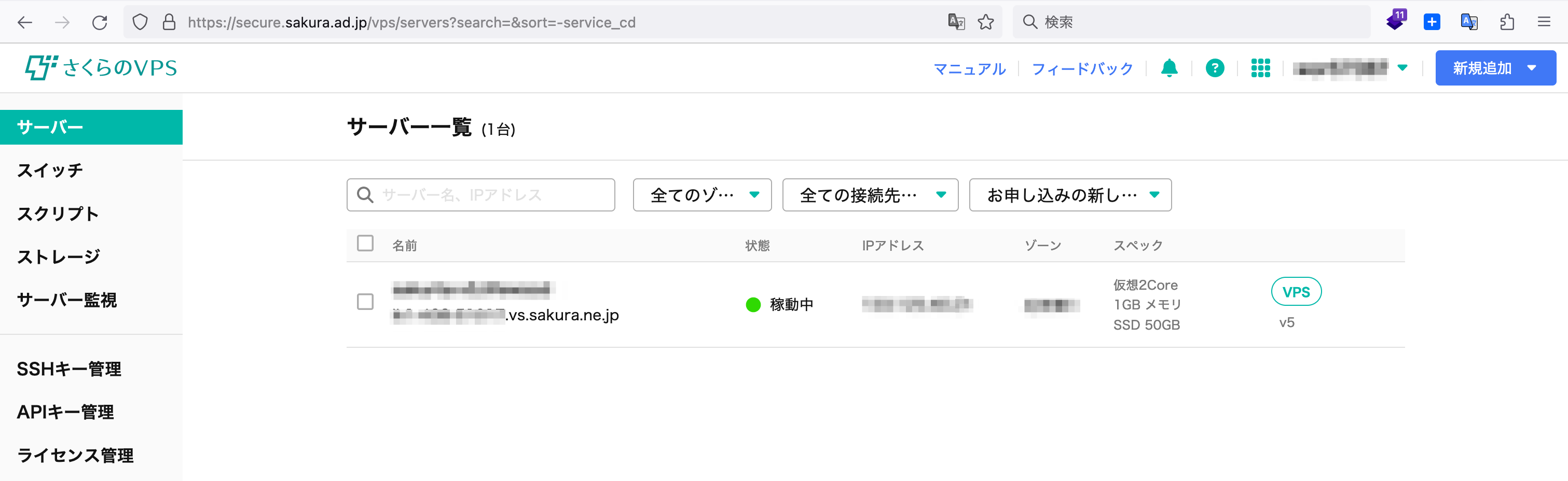 - 「サーバー一覧」に、契約したサーバーが表示されます。