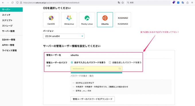 Ubuntuを選択したら、管理ユーザーのパスワードを設定します。ここで入力したパスワードを、管理ユーザー名(ubuntu)とともにメモしてください。