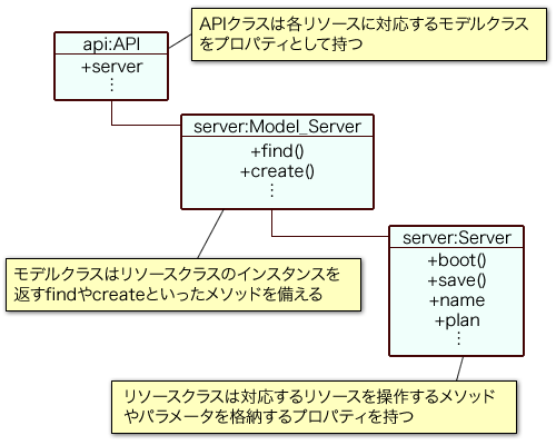 前述のとおり、saklientでは各リソースに対応するモデル経由でリソースにアクセスする。たとえばサーバーへの操作を行うにはまずModel_Serverクラスのインスタンスを取得し、createメソッドやfindメソッドを呼び出して実際のリソースに対応するServerクラスのインスタンスを取得する。