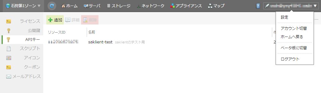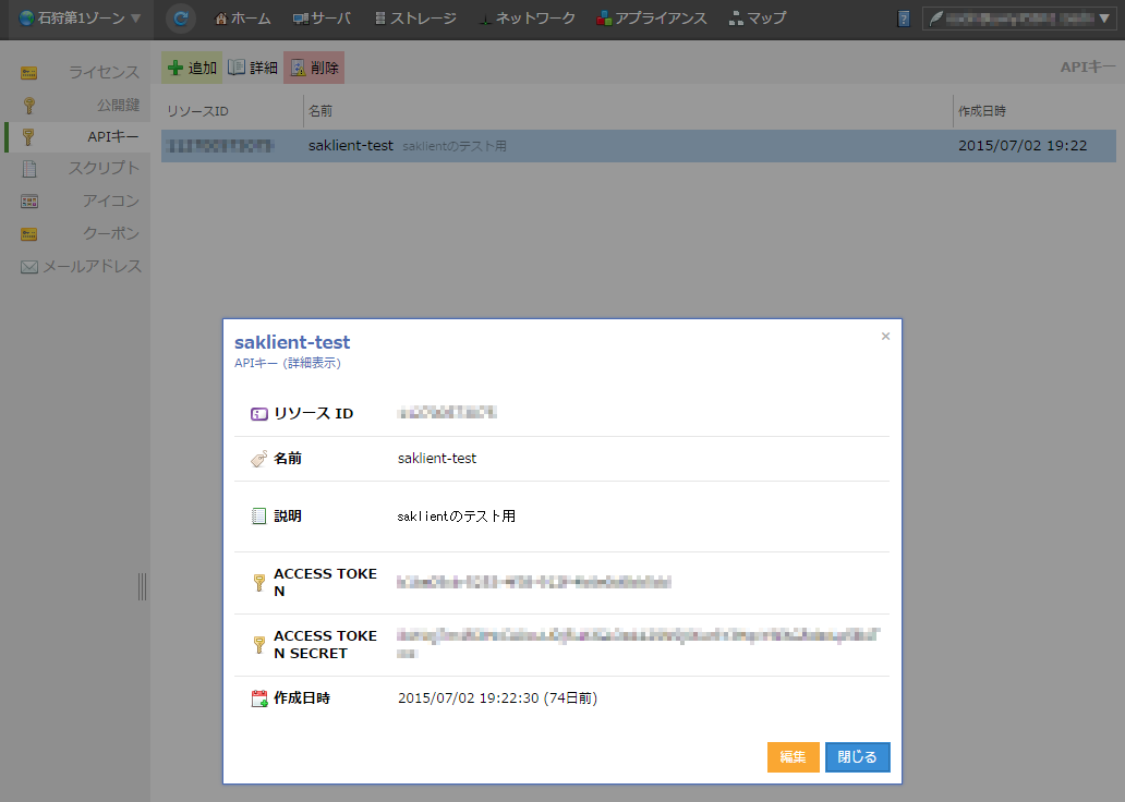 なお、ここでtoken変数はAPIキーを、secret変数はシークレットトークンを文字列として格納した変数となる。これらはさくらのクラウドコントロールパネルの「設定」画面にある「APIキー」画面で入手できる(図2)。