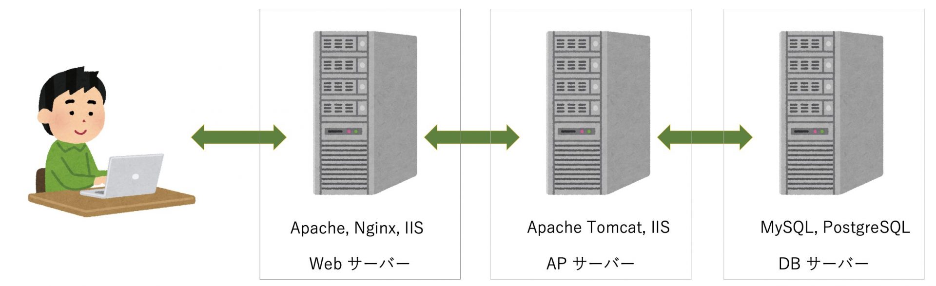 | Web(ウェブ)サーバー | Webブラウザなどを通じてユーザの指示を受け付ける窓口です。 | Apache, nginx, IIS |