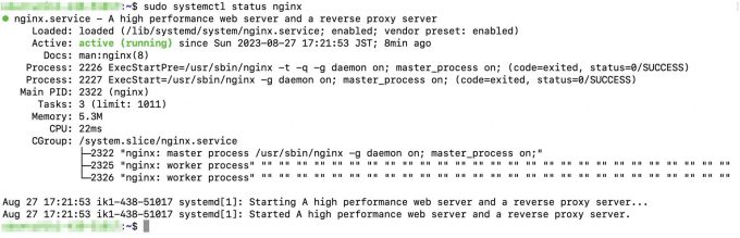 「Active: active (running)」と表示されていれば、nginxは起動しています。