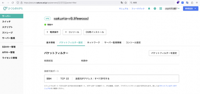 さくらのVPSのパケットフィルター設定