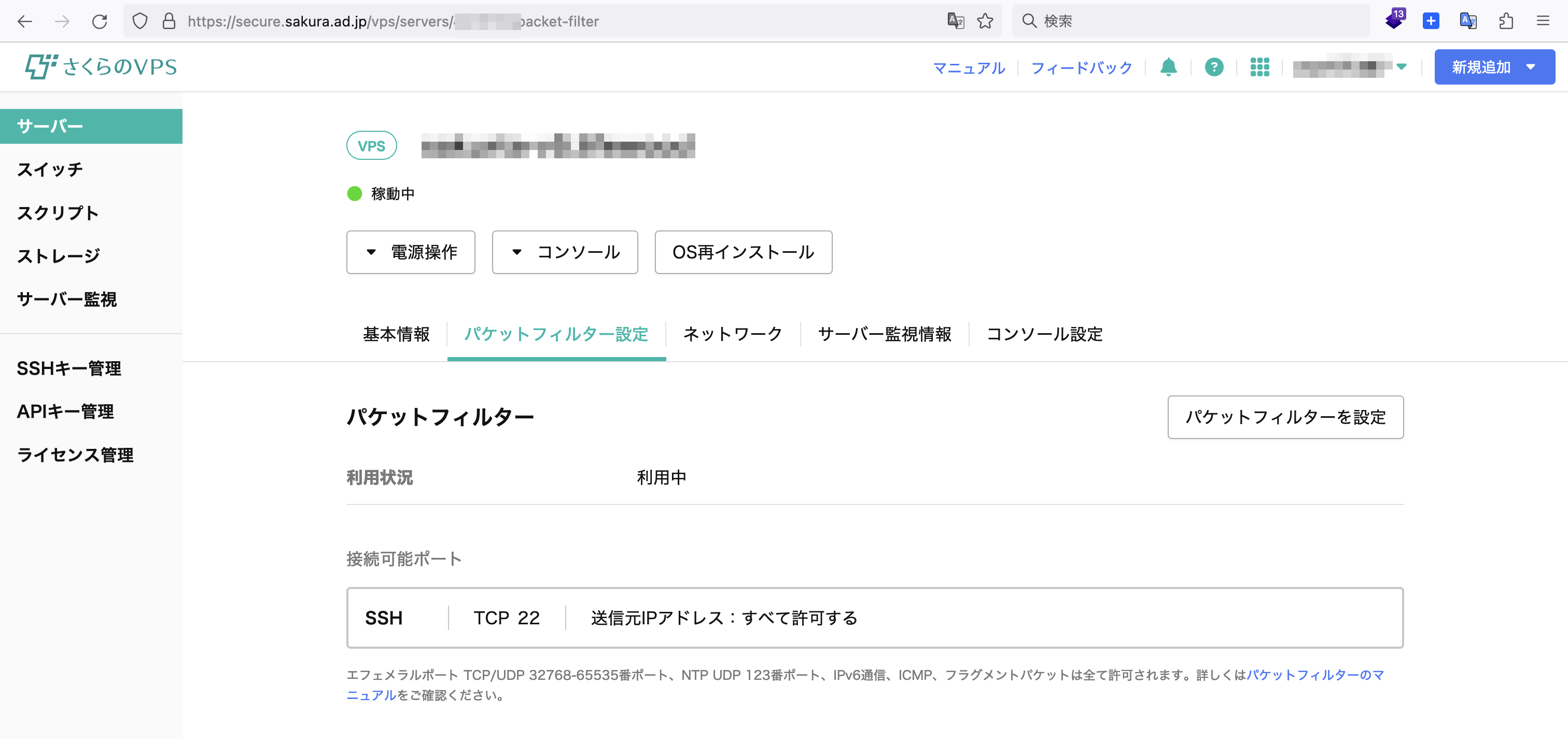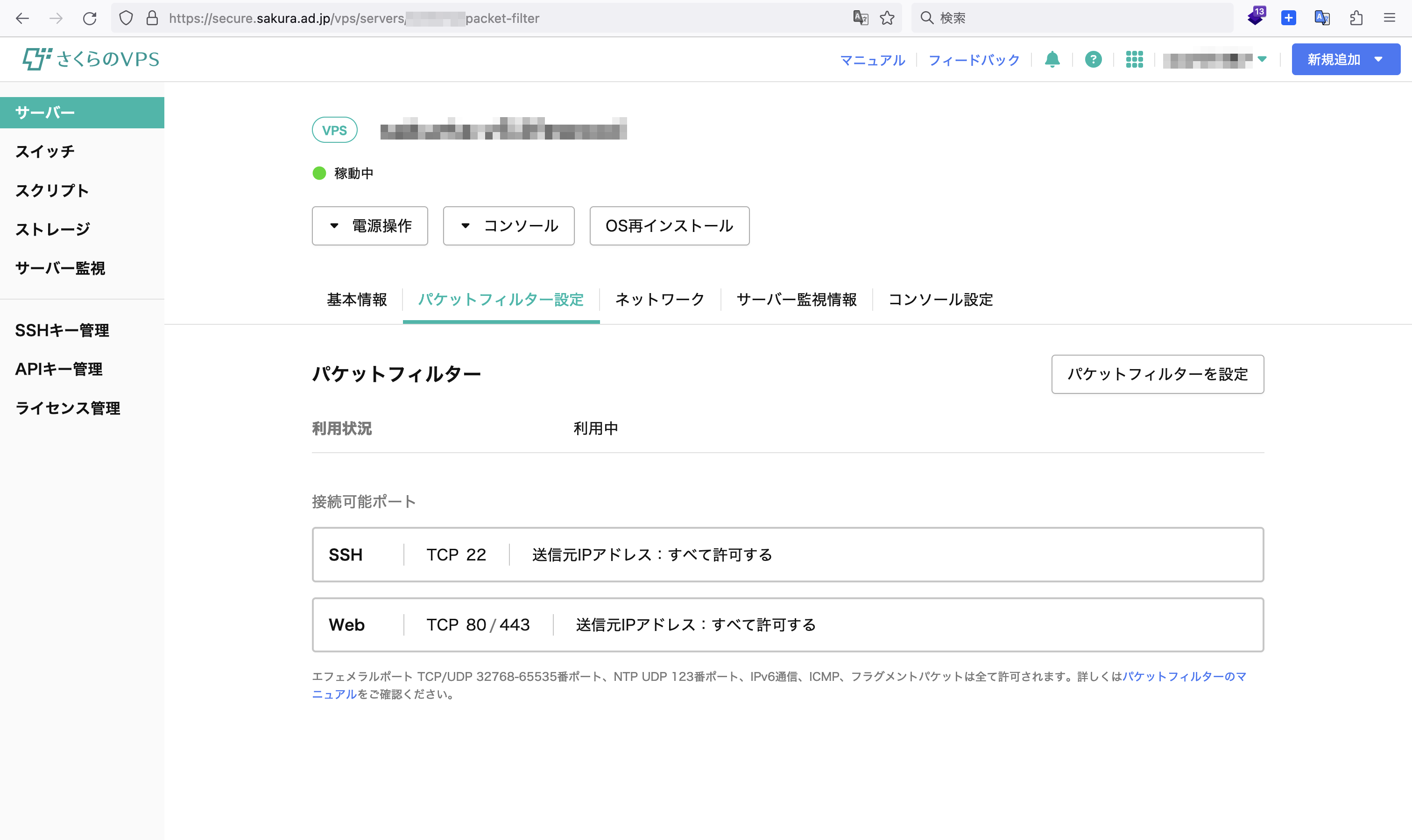 これで、さくらのVPSのパケットフィルターの設定が完了しました。