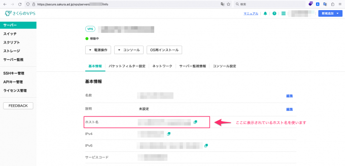 サーバーのホスト名は、さくらのVPSのコントロールパネルから入手します。コントロールパネルにアクセスし、サーバー情報の画面にある「ホスト名」に表示されているものを使用します。(ちなみに、ホスト名の右にあるコピーボタンを押すとコピーできます)