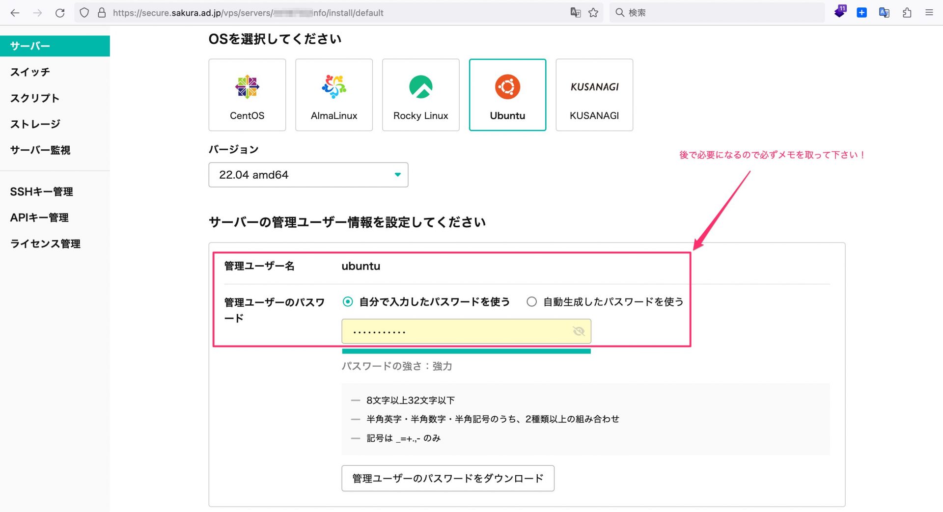 ubuntu@host-name.vs.sakura.ne.jp's password: