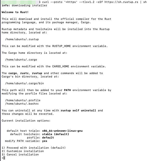$ curl --proto '=https' --tlsv1.2 -sSf https://sh.rustup.rs | sh