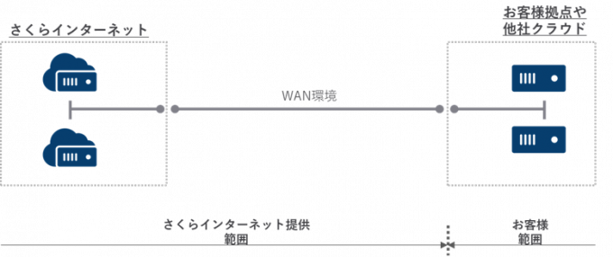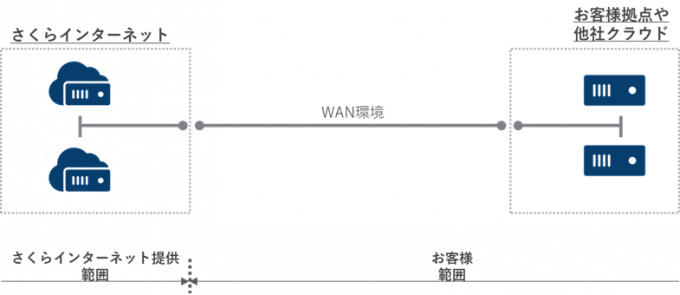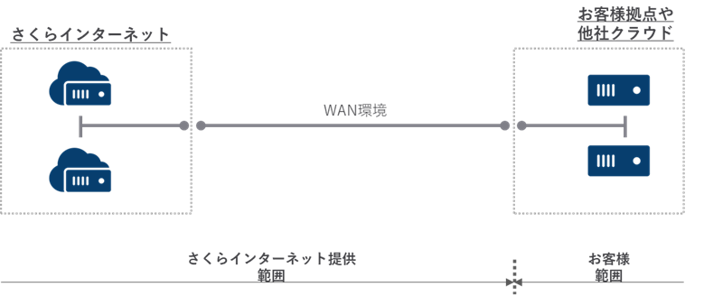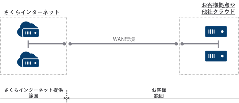 対向先の拠点(クラウド)までの回線環境を提供するため、お客様にてWAN環境の調達は不要となります。また、WAN環境の運用保守はさくらインターネットにて実施することから、複数の契約先を管理する必要が無く運用負荷が下がるといった特徴があります。