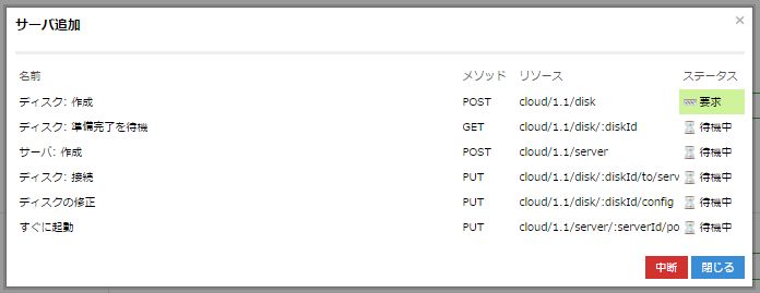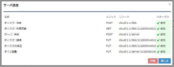 「操作確認」画面で[作成]をクリックすると、仮想サーバの作成が開始されます。