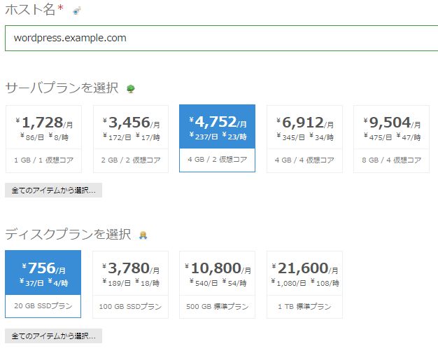 「ホスト名」に任意のFQDNを入力し、サーバプラン・ディスクプランは以下のとおり選択します。