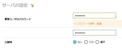 「サーバの設定」で、[管理ユーザのパスワード]を入力し、画面をスクロールさせて[作成]をクリックします。