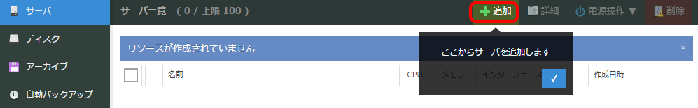 サーバの作成が完了した後、左メニューの「サーバ」をクリックし、サーバ一覧を表示させます。