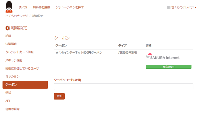 組織設定画面に遷移するので、左側のメニューの「クーポン」をクリックします。ここでクーポンコードをテキストボックスに入力し、下の「追加」ボタンをクリックします。