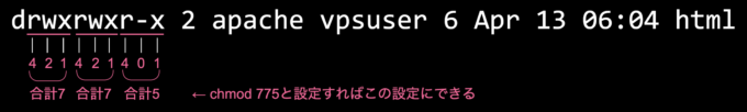 chmodは権限を変更するコマンドです。htmlディレクトリを775という権限にしています。