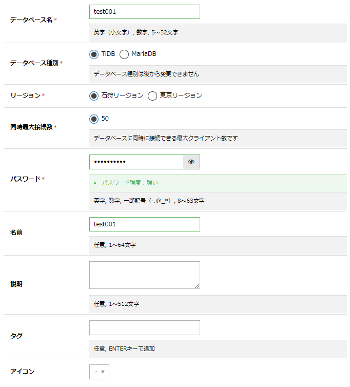 | 作成可能数 | TiDB・MariaDBの合計で 1アカウントあたり20個まで |